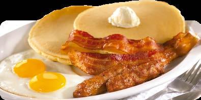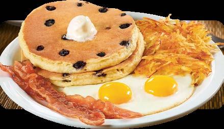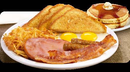 Dos panqueques, una rebanada de jamón a la plancha, dos tiras de tocino, dos salchichas, dos huevos,* papas hash browns o frijoles fritos o rancheros y pan de tu elección. $10.50