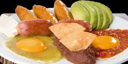 Dos huevos al gusto, plátano maduro frito, mantequilla, queso crema, frijoles fritos o rancheros tortillas de maíz o pan de tu elección y salsa ranchera.
