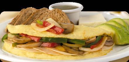 Omelette de tres claras de huevo jamón de pavo, pimientos, cebollas y champiñones salteados. Acompañado de queso fresco, aguacate, salsa verde y pan integral. $9.25