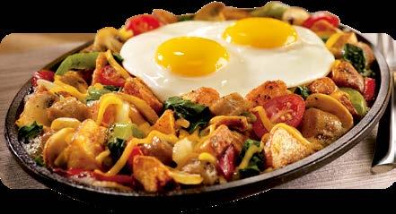Papas rojas sazonadas, cebollas y pimientos asados, champiñones y una mezcla de vegetales cocidos en un sartén de hierro caliente con dos claras de huevo revueltas con espinaca y tomates cherry. Servidos con salsa en un sartén de hierro caliente. $7.75