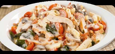 Cremosa pasta penne elaborada con una suculenta salsa Alfredo, con tu elección de camarones o tiras de pechuga de pollo a la parrilla, un toque de tocino, espinaca fresca, tomates cherry, champiñones frescos y quesos italianos. Acompañada de pan con ajo.