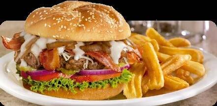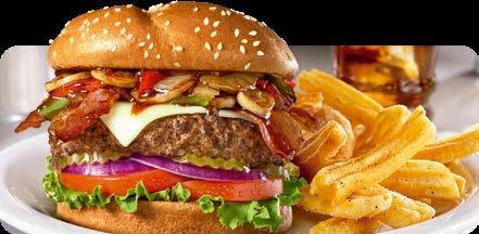 Una hamburguesa cubierta con queso cheddar, tocino, champiñones salteados, cebollas y pimientos asados. Servida con lechuga, tomate, cebollas rojas, pepinillos y una exquisita dulce salsa bourbon. $11.00