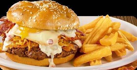 Una hamburguesa 100% carne de res, con crujientes papas hash browns, un huevo cocinado a tu gusto, dos tiras de tocino y todo cubierto de salsa de queso. $10.25