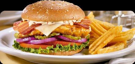 Una pechuga de pollo sazonada y asada cubierta con queso suizo derretido, tocino y una salsa cremosa de pimienta. Servida en pan integral con lechuga, tomate, cebollas rojas y pepinillos. $9.50