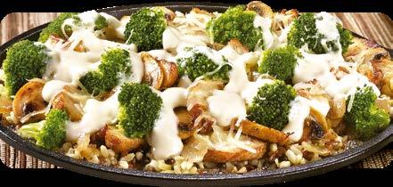 Pollo sazonado y asado con cebollas caramelizadas, champiñones salteados y brócoli servidos sobre arroz de grano integral. Cubierto con quesos italianos y salsa de queso gouda. $11.75