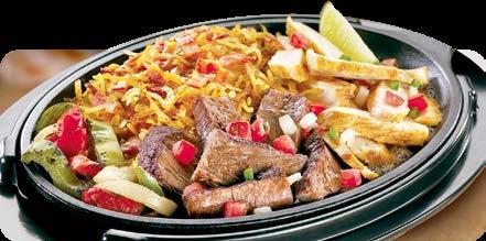 Tierno steak y jugosa pechuga de pollo chispeantes con pimientos y cebollas asadas, papas hash browns con trocitos de tocino y queso cheddar derretido. Servido con pico de gallo recién hecho y crema ácida. Todo servido en un sartén de hierro caliente. $11.00