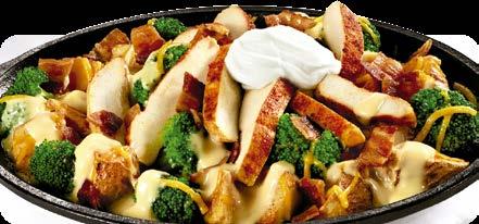 Pechuga de pollo sazonada y asada con papas rojas sazonadas, tocino picadito y mezcla de vegetales cocidos. Servido en un sartén caliente, coronado con salsa de queso, queso cheddar rallado y una cucharada de crema ácida. $9.75