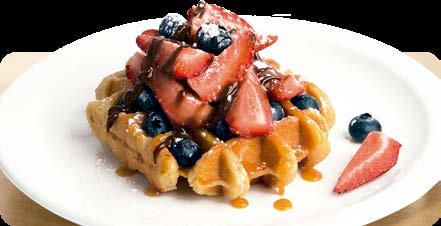 Un Belgian Waffle con deliciosas fresas y arándanos, caramelo y chocolate fudge. Cubierto con azúcar glas. $4.75