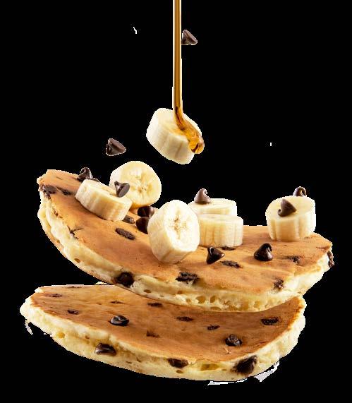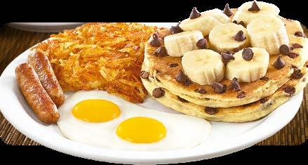 Chispas de chocolate dentro de dos buttermilk pancakes, cubiertos con banano más chispas de chocolate encima. $8.25