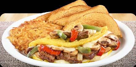 Omelette de tres huevos con prime rib a la parrilla, acompañado de pimientos, cebollas y champiñones salteados, con queso suizo derretido. $10.25
