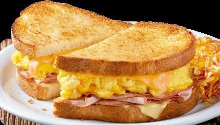 MOONS OVER MY HAMMY ® Sándwich de dos huevos revueltos y jamón, con quesos suizo y americano, en pan sourdough a la plancha. Servido