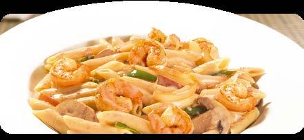 Cremosa pasta penne elaborada con una suculenta salsa Alfredo, con un toque mexicano de chile chipotle y jalapeños dando un sabor picosito junto a abundantes vegetales. Acompañada de pan de ajo y tu elección de camarones o pechuga de pollo a la parrilla.
