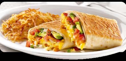 Tocino, aguacate, huevos revueltos, nuestro queso cheddar, pico de gallo y salsa chipotle; envuelto en una tortilla grande y asado a la plancha. Acompañado de papas