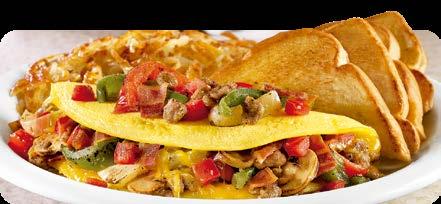 Omelette de tres huevos con salchicha, tocino, pimientos y cebollas asadas, champiñones, tomate picado y queso cheddar. $8.25