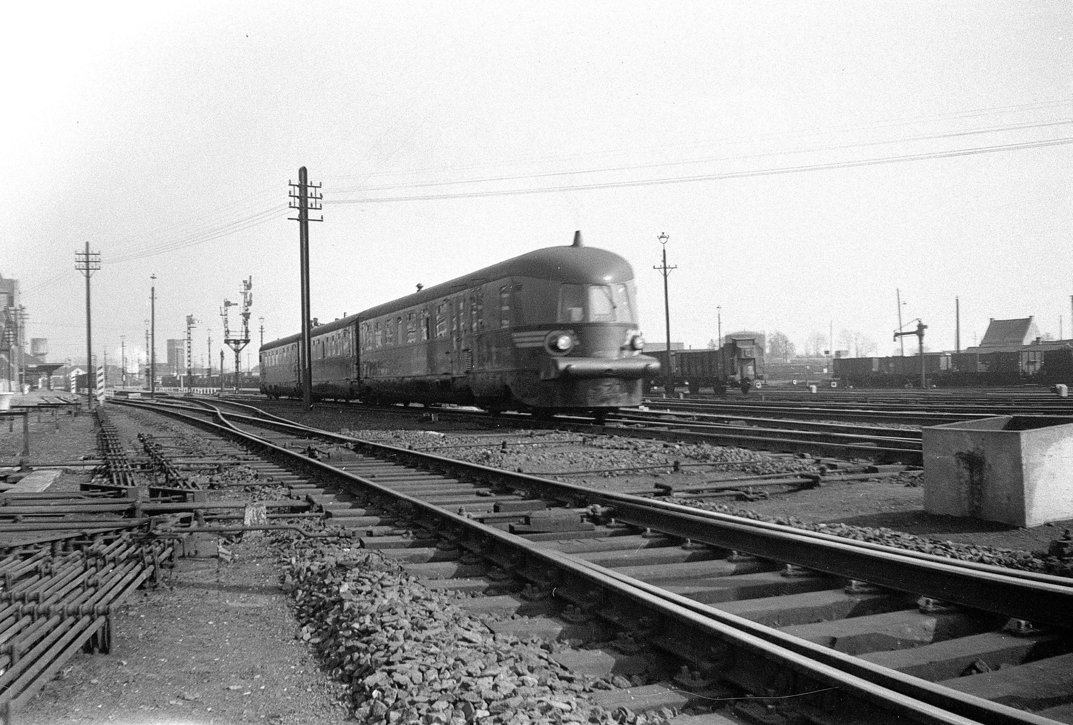 De andere uitrit van het station Kortrijk, richting lijn 75 naar Gent-Sint-Pieters en verder Antwerpen. Boven de 670.06 die van Kortrijk vertrekt, onder de terugkeer van dit motorstel, beide genomen op 9 oktober 1964.