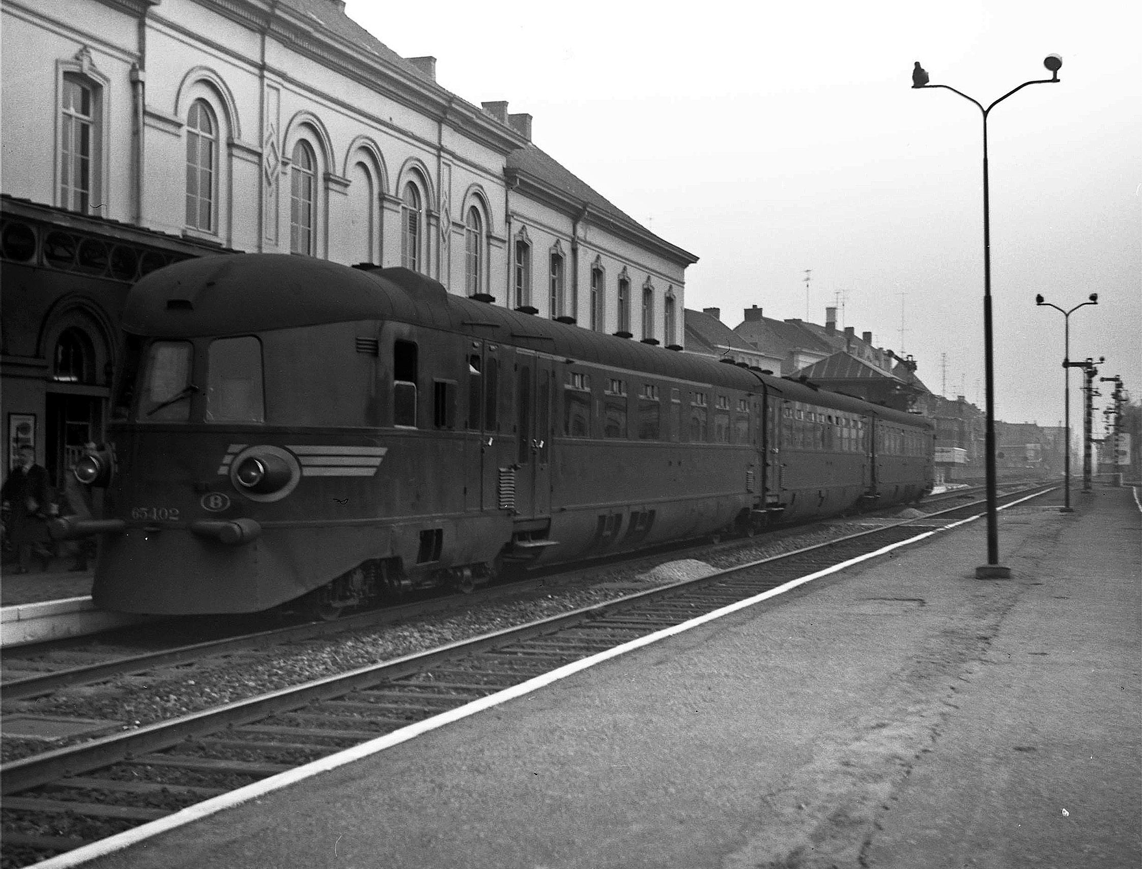 Eén van de standaardbedieningen door motorstellen: de rechtstreekse treinen Kortrijk - Gent - Antwerpen-Linkeroever. Op 24 april 1965 stopt de 654.02 even voor het oude stationsgebouw van Sint-Niklaas.