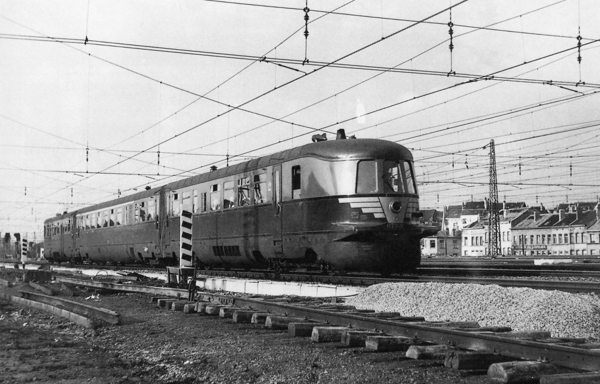 De beginjaren zestig werd dit motorstel type 654 gefotografeerd op een niet te herkennen plaats, waarschijnlijk in de buurt van Charleroi. Alles straalt nog de oude spoorwegsfeer uit (armseinen, houten telefoonpalen, ...).