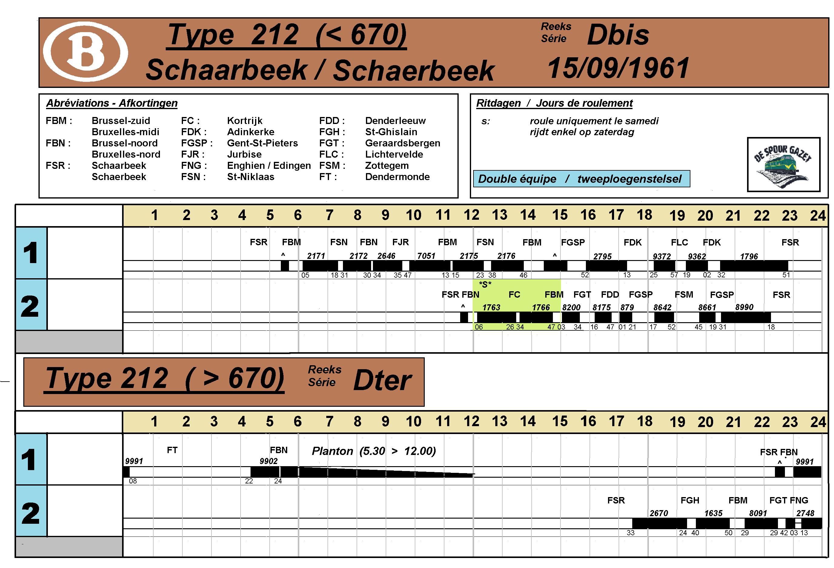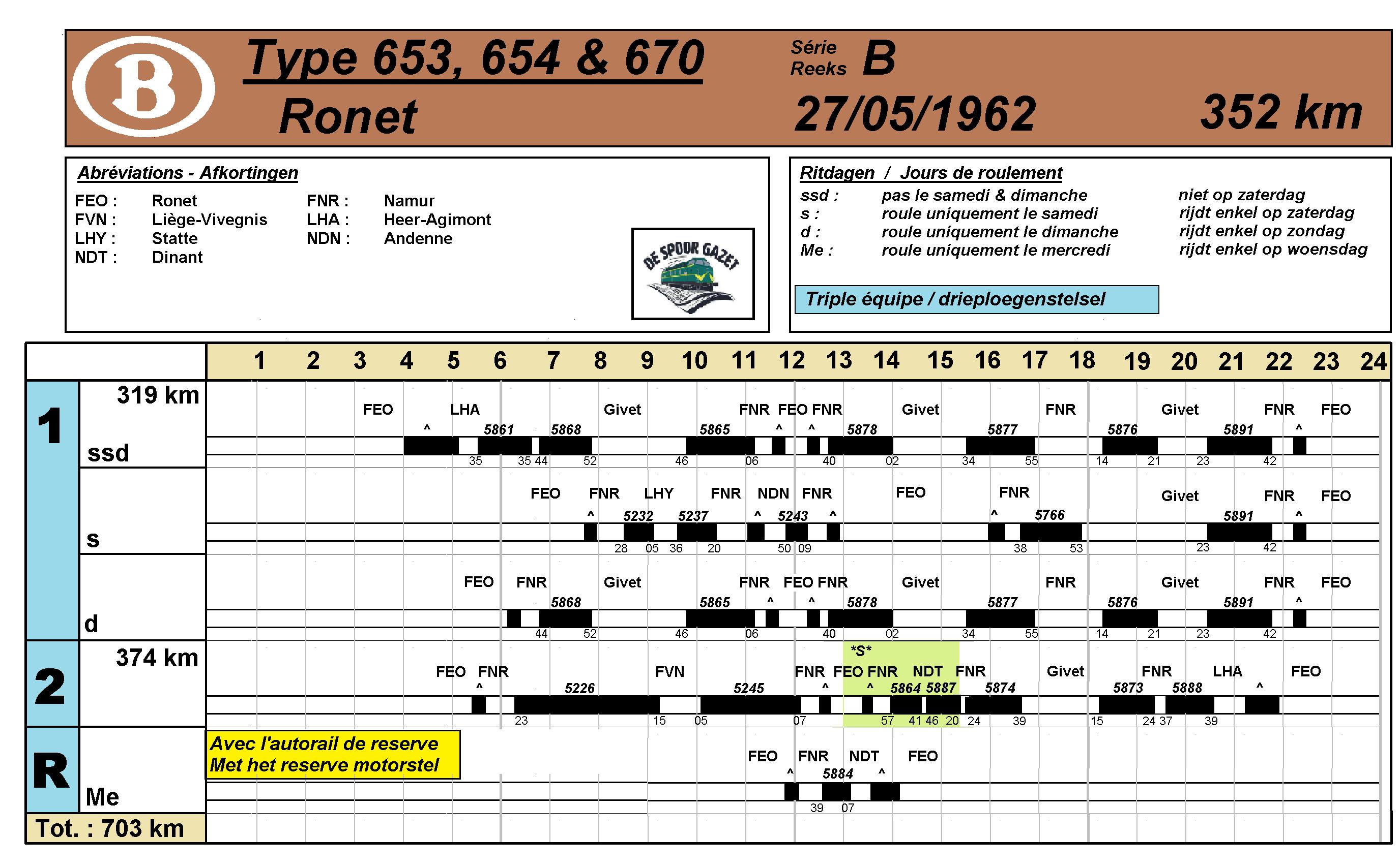 Nochtans had men met ingang van dezelfde zomerregeling één plandag van het type 620 overgeheveld naar de drieledige stellen. Deze omvatte vooral diensten vanuit Charleroi naar Mariembourg en van hieruit verder naar Couvin en Treignes. Op de verbinding naar Erquelinnes werd ook één treinpaar voorzien. Deze reeks wordt hier grafisch uitgebeeld.