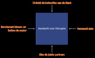 2. Sta dicht bij de klant: Krijg inzicht in de toekomstige verstoringen. Denk hierbij aan gesprekken over klantbehoeftes of surveys over het klantgedrag. Zo krijgt de organisatie een duidelijker beeld van wat er speelt bij de klant;