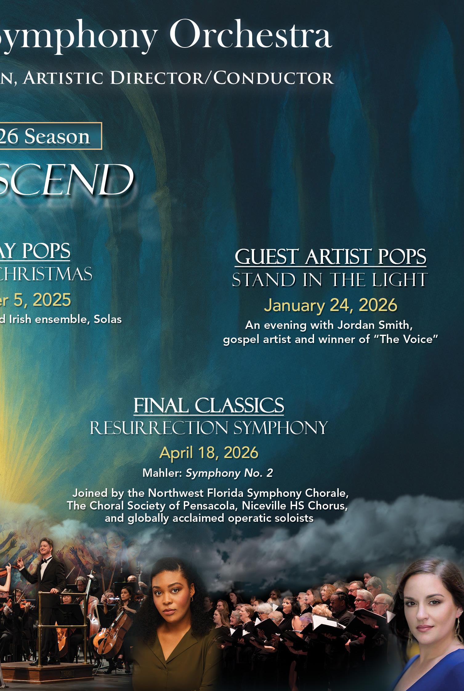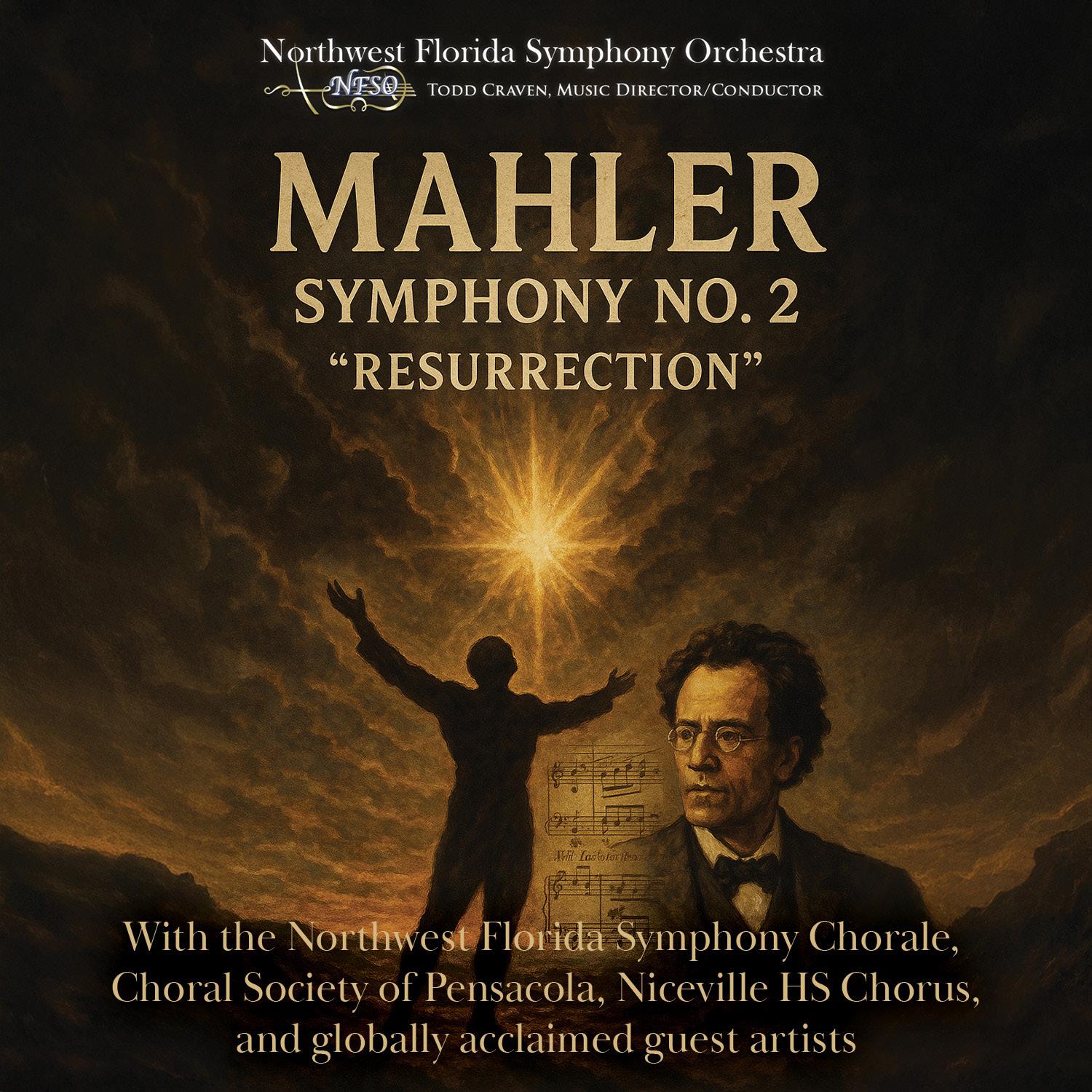 For this unforgettable performance, the Northwest Florida Symphony Orchestra is joined by over 150 voices, including the Northwest Florida Symphony Chorale, the Choral Society of Pensacola, students from the Niceville High School Chorus, and two guest operatic soloists. From the intimate to the explosive, Mahler’s vision will be brought to life with massive orchestral and choral forces in a concert that promises to shake the walls and stir the soul.