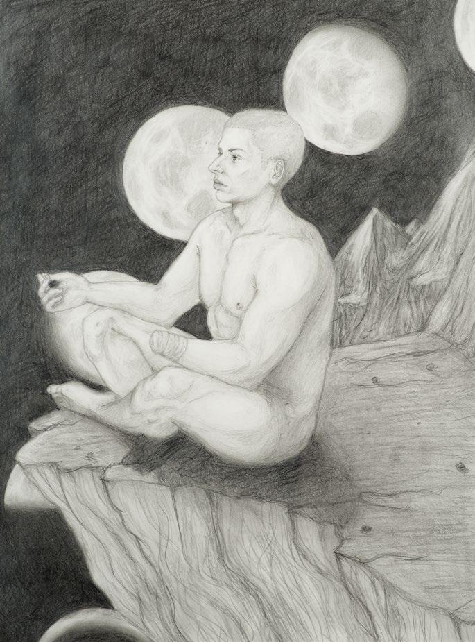 Look straight up, stretch, hold the balance of Orion’s bow in the arc of your shoulder blades. We are just two lonely heartbeats surrounded by the black trees, the moon, a glass half full of glowing wine, and behind it, the god of lightning.
