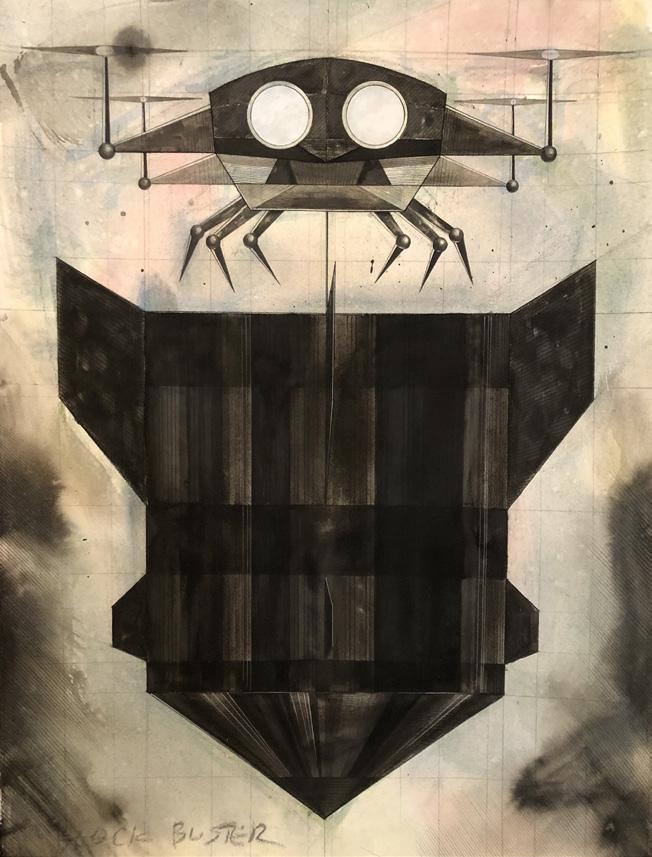 Kevin blends materials, just as he blends realities, through an admixture of realism and fiction. He uses drawing, painting, and sculpture, utilizing a variety of traditional and recycled materials— some quiet and others bright—as he considers family history, military service, weapons, machinery, planes, memorials, monuments, even spaceships, and, ultimately, peace.