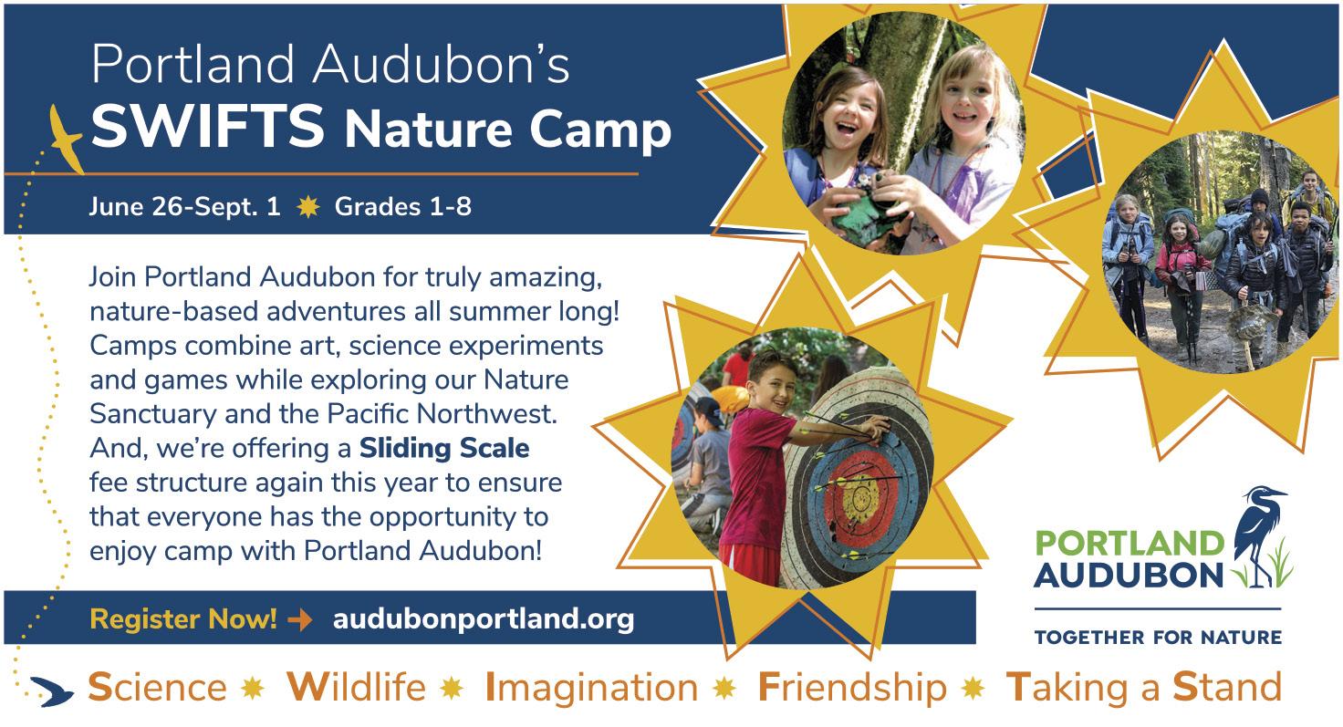 Join Portland Audubon for SWIFTS Nature Summer Camp! Whether kids discover newts along our trails, observe a Bald Eagle soaring over the Gorge, or gain new outdoor skills, campers get to learn, play, & explore, all while making friends!