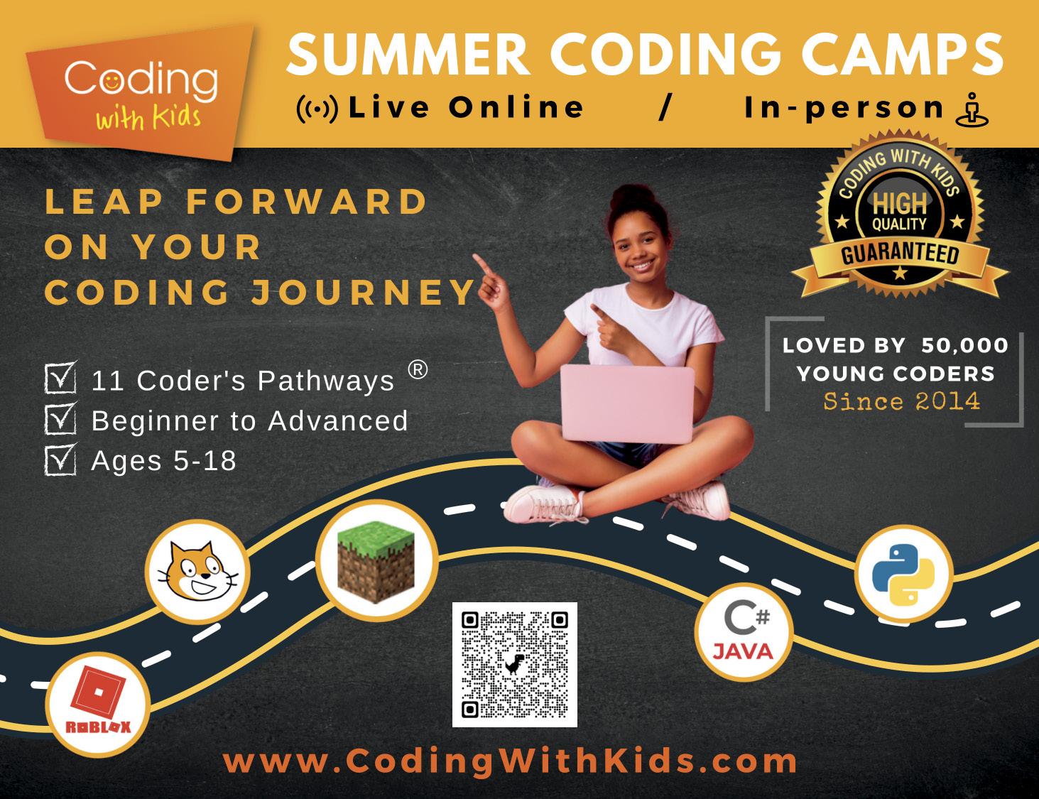 They provide online and in-person camps through their unique Coders Pathways®️ for ages 5-18. Online camps are led live by an instructor. Their camps have small groups size, and teach a variety of subjects like Python Programming, Scratch Game Development, Minecraft Modding, Roblox Adventure Games, Little Coders, Robotics, and much more! Their half-day camps are available for AM & PM sessions or combine into a full-day camp. codingwithkids.com