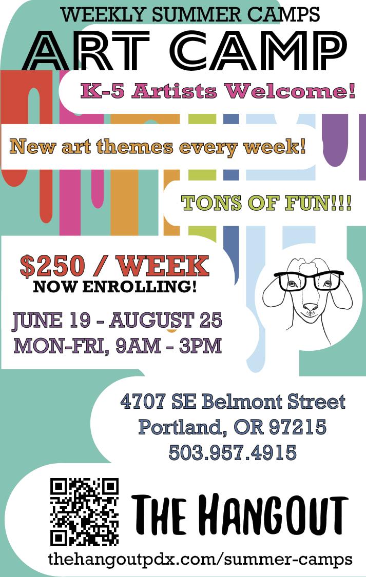 These fun and enriching K-5 summer camps are designed for the artist of every level! From the novice painter to the expert clay maker, they work with all campers to inspire creativity, self-confidence, and friendship while introducing them to new art mediums and exciting experiences! thehangoutpdx.com/summer-camps