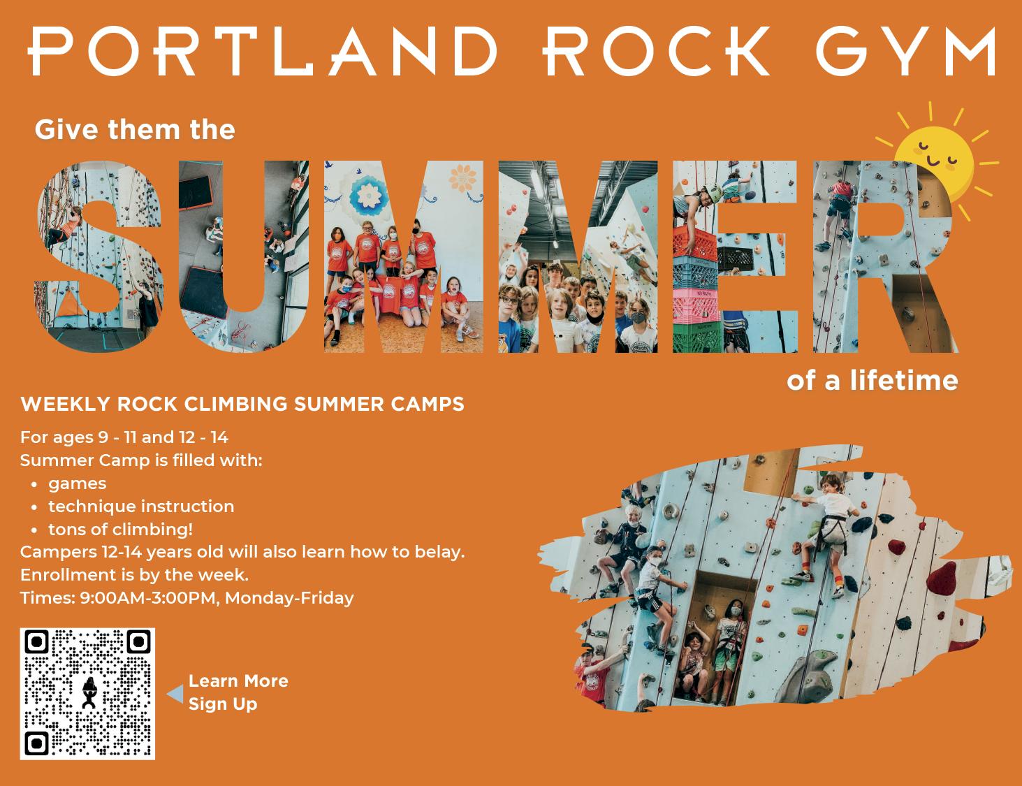 Indoor Summer Camps at the climbing gym! For ages 9 - 11 and 12 - 14. The days are filled with games, technique instruction, and of course a lot of climbing! Campers 12-14 years old will also learn how to belay. Enrollment is by the week. PRG will be offering a few weeks of all outdoor camps for ages 10 - 14. portlandrockgym.com/camps