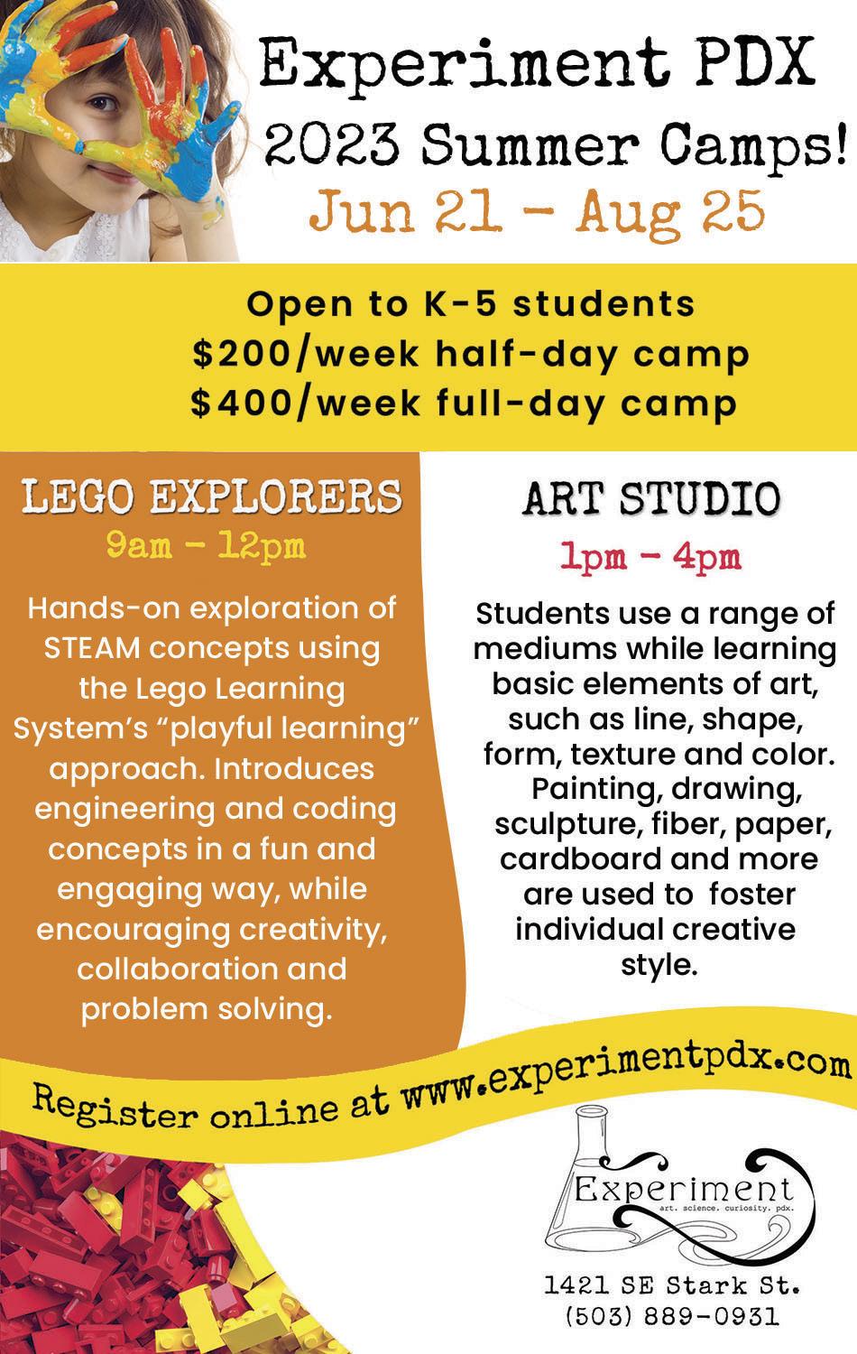 Experiment PDX is all about science and art and this summer’s offerings include Lego Explorers, Art Studio and camps offered by Coding for Kids and Mad Science. experimentpdx.com