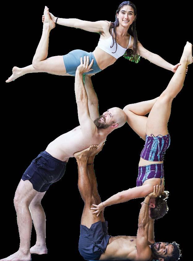 THE SWEET, sticky scent of sun-cured Mexican flower filled the air as we passed the dutchie to the left, barefoot and beaming under the watchful gaze of Mama Frida, peering through the aerial hoops. With each exhale, the worries of the world drifted further away, replaced by giggles, bright eyes and the knowing spark of something magical unfolding. We were in the heart of Playa del Carmen, Mexico — the tropical evening breeze carried the jungle’s vibrant resonance, setting the tone for an AcroYoga adventure that is sure to lift us into a whole new dimension.
