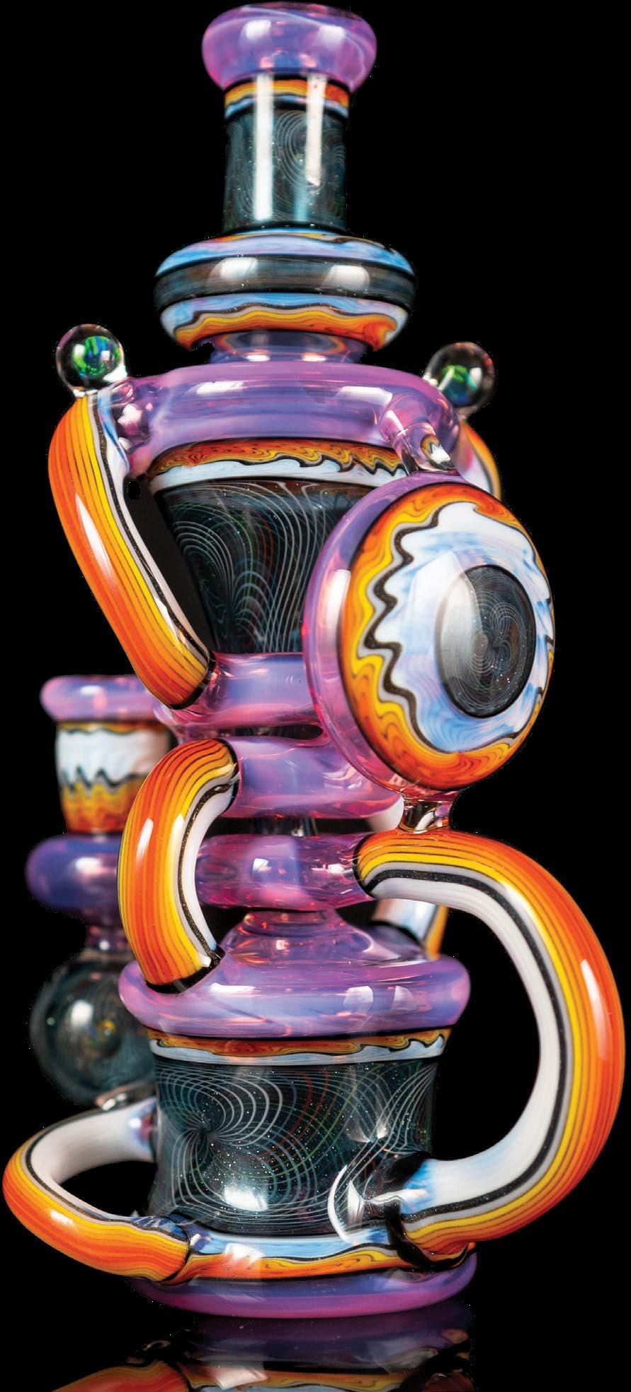 On the cover of California Leaf’s always awaited Glass Issue is the stunning work of Berkeley-based glass-blowing OG Dustin Revere, who spent years honing learning how to merge art and function using ceramic, glass, metal, and other media. He created this piece in a collaboration with legendary artist Pyro for Revere’s educational YouTube channel, Revere Glass. The piece features Pyro’s Tripdocycler shape and Revere’s wigwags and rattichello coloring techniques. Be sure to read more in our profile on pg. 24,andstopbyourwebsiteat LeafMagazines.com to see more glass art andeachofoursixmagazine’suniquecovers.