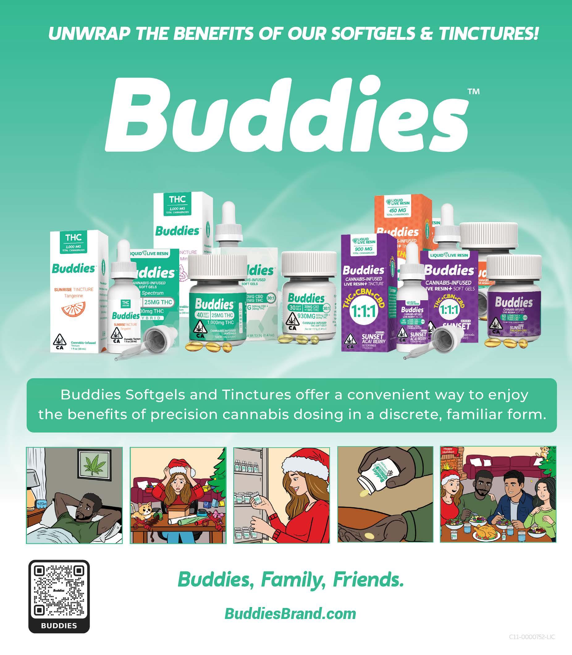West Coast’s Buddies is one of those long-standing powerhouse brands that delivers consistency across all of its product lines. An early player in the vape cartridge game, Buddies has since expanded into other categories, including its stellar line of gummies. Formulated with cannabinoid dosages designed to achieve specific effects and matched with complementary flavor profiles (i.e., bright citrus flavors matched with uplifting Sativa effects), these gummies are a go-to for the delectable delivery of delight. The Sunrise Tangerine gummy, with its 2:1 ratio of THC:THCV, was particularly helpful for energizing us through the Thanksgiving holiday. @buddiesbrand_apparel