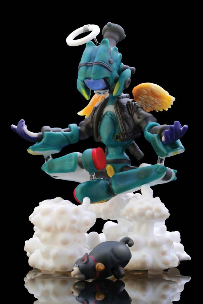 Nearly 10 years ago in 2016, this pipe sold for more than $100,000 at auction — a momentous day in the world of high-end glass art. Mothership Glass’ Scott Deppe and solo artist Sagan Glass made this unbelievable Fabergé moon-phase egg. As a functional pipe, this piece pushes the limits of how far bongs can go. With several crescent and full moons adorning it, there is always another facet of this work of art to catch your eye. The gigantic moon marble near the bottom of the piece was legitimately launched into space before the construction of this pipe. Photo courtesy MothershipGlass.com