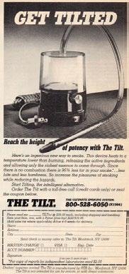 tised in the back of High Times magazine. According to its manufacturers RTA Inc., smoking from The Tilt offered 80% more THC and 96% less tar than from a pipe or joint. But alas, after the release of the DEA’s Model Drug Paraphernalia Act (an amendment to the Controlled Substances Act that defined and prohibited the sale of drug paraphernalia) in 1979, The Tilt became illegal and went out of business.