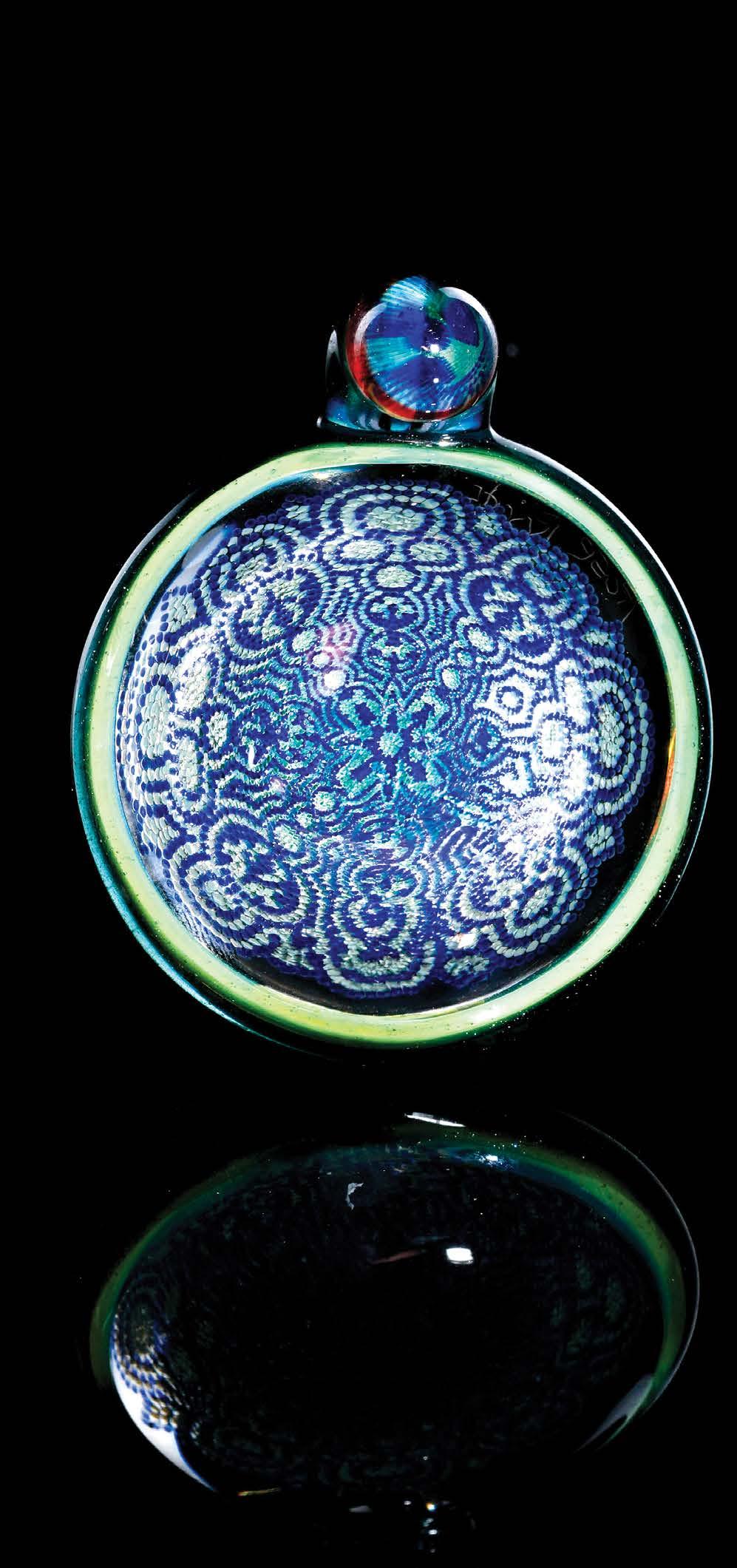 Now living in Humboldt County with his wife and dog, Beck started blowing glass in a school bus in Orrick in the late ’90s. “Back then, there were about six of us cranking out secret word pipes all day,” he said. “As an artist, I’m more into pattern work than functional stuff.” But it wasn’t until after a tragic accident that he discovered the look he’s famous for today.