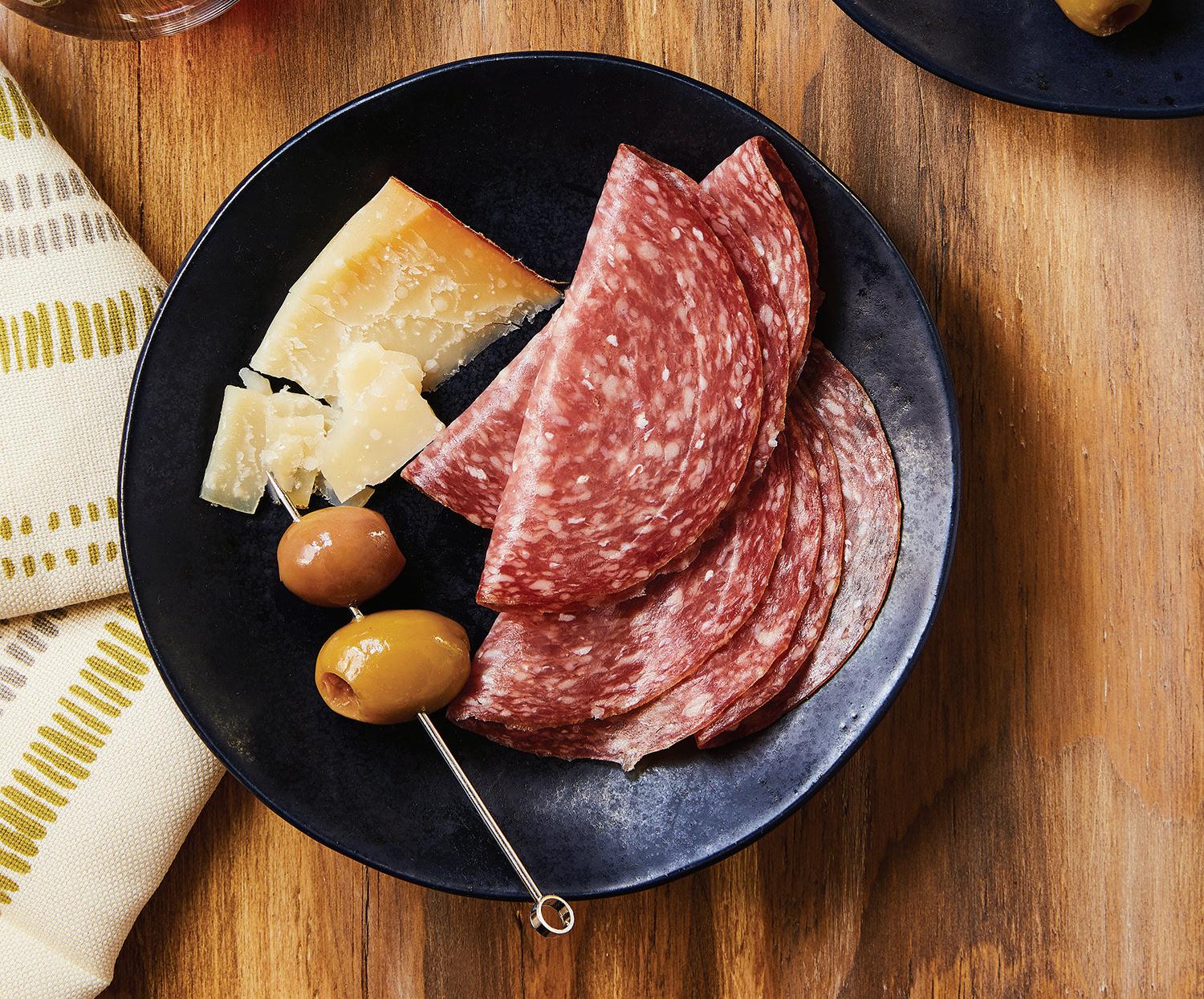 On a cheese board or platter, arrange genoa salame, featuring the rich flavors pulled from the spices and wine used in its making. Pair with an aged, firm sheep’s cheese such as Vintage Grand Ewe, with notes of toasted almond, maple syrup and cultured butter. The sweetness of the cheese gives way to the genoa salame to be the star. Finish the board with skewered olives and serve with an unfussy red wine low in tannins like Syrah.