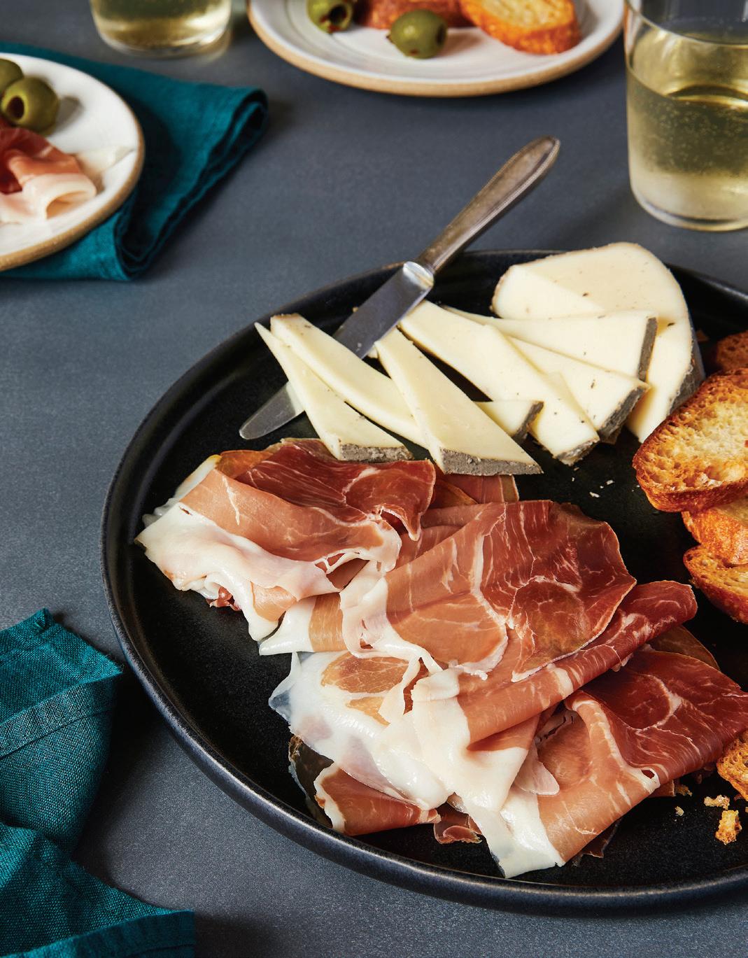 Start your cheese board or platter with savory capocollo laced with pockets of cured fat that balance out the meat. Its mild smokiness works well with an aged sharp cheddar for a salty, intriguing but complementary match. Serve with a side of thymeinfused honey for herbaceous sweetness. Pair with Txakoli, a dry Spanish wine that’s easy to drink with hints of salt and pinesap. ❚