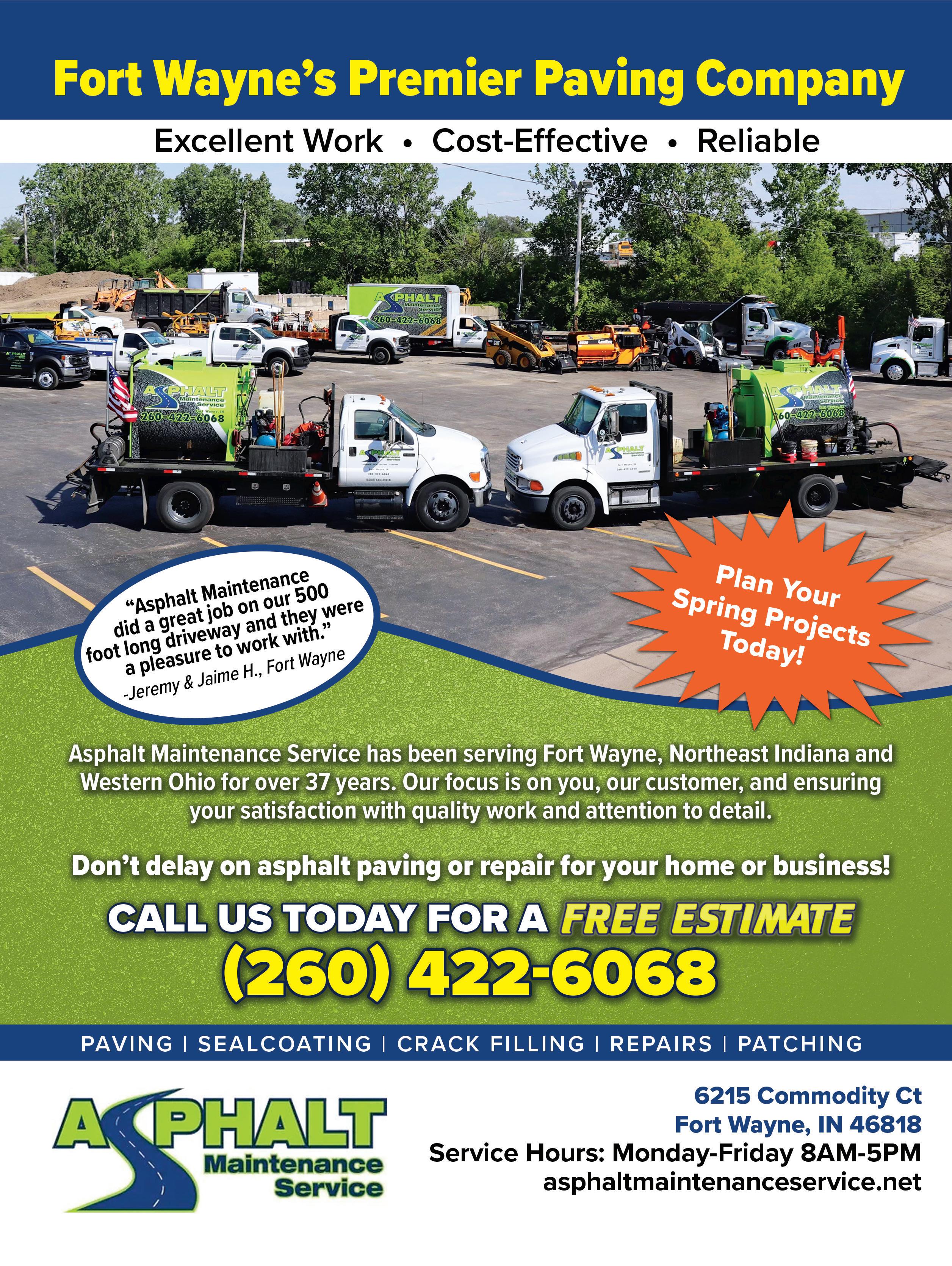 Asphalt Maintenance Service is open from 8 a.m.-5 p.m. Monday through Friday. Get a free estimate by filling out the online form at asphaltmaintenanceservice.net or call (260) 422-6068.