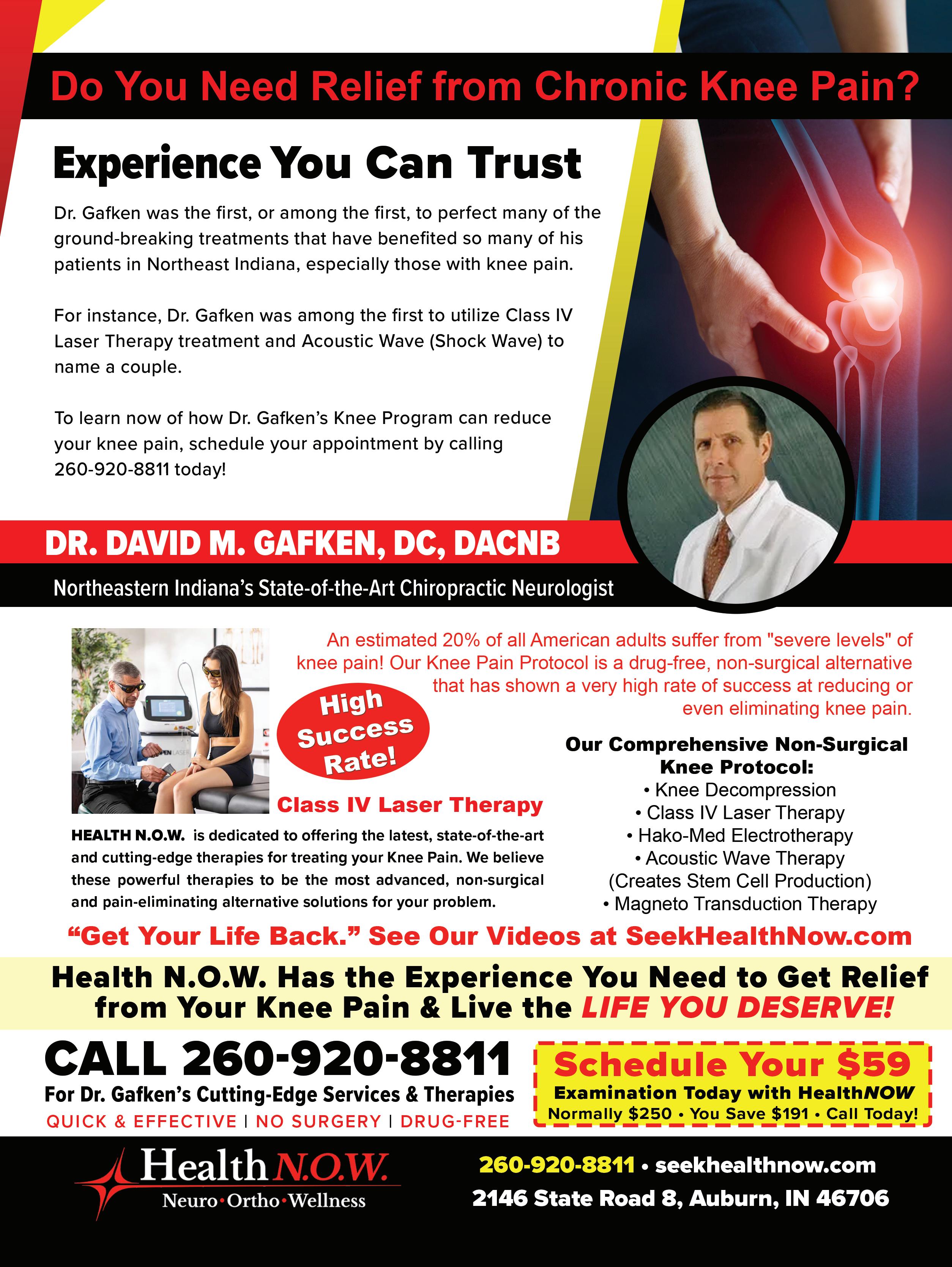Dr. David Gafken has been a leader in bringing new technologies to this region for the benefit of his patients. His decades of experience enable him to treat certain conditions more effectively than ever before without surgery or medicine at Health N.O.W., in Auburn.