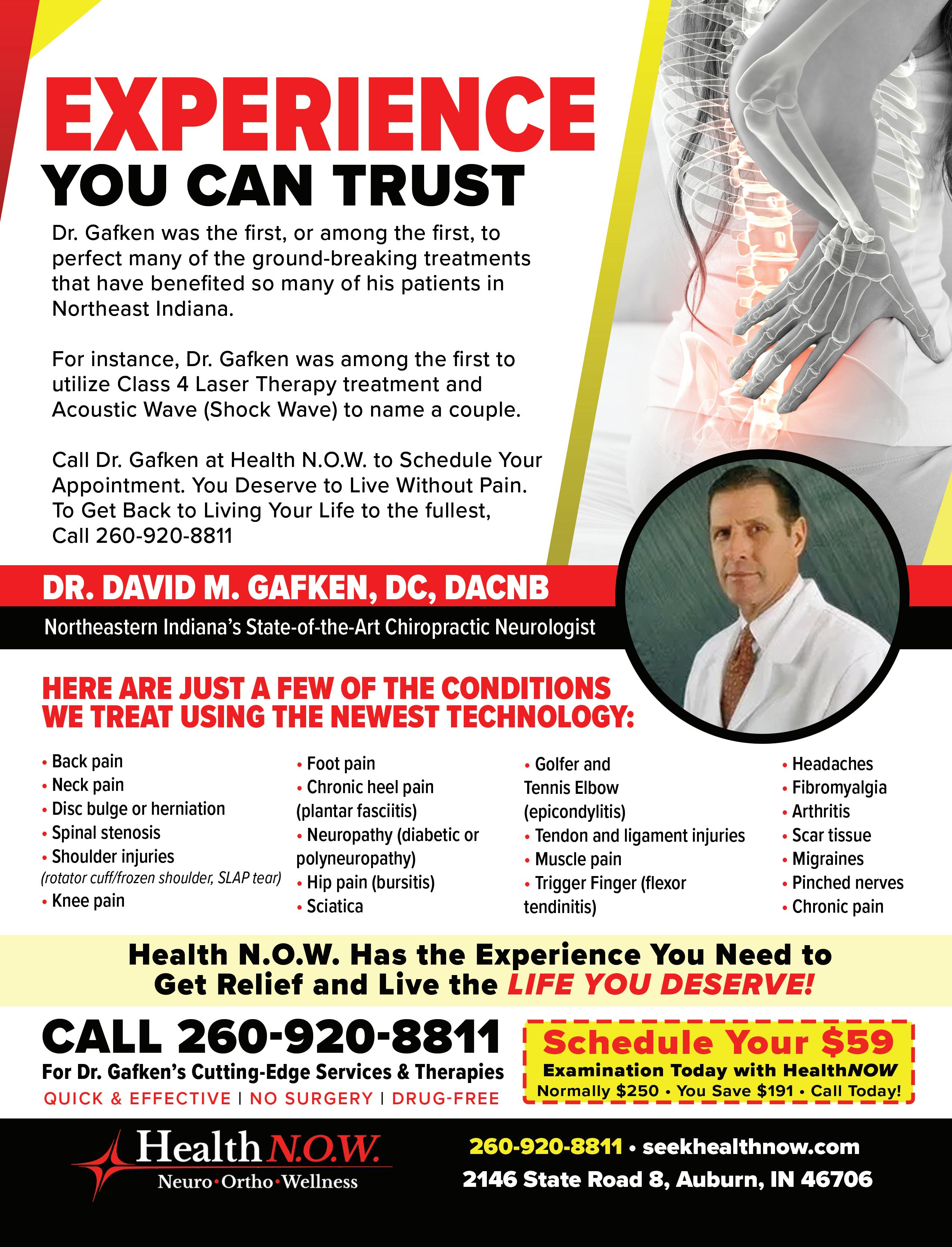 Dr. David Gafken, a board-certified chiropractic neurologist, can treat his patients without surgery or medications at Health N.O.W.