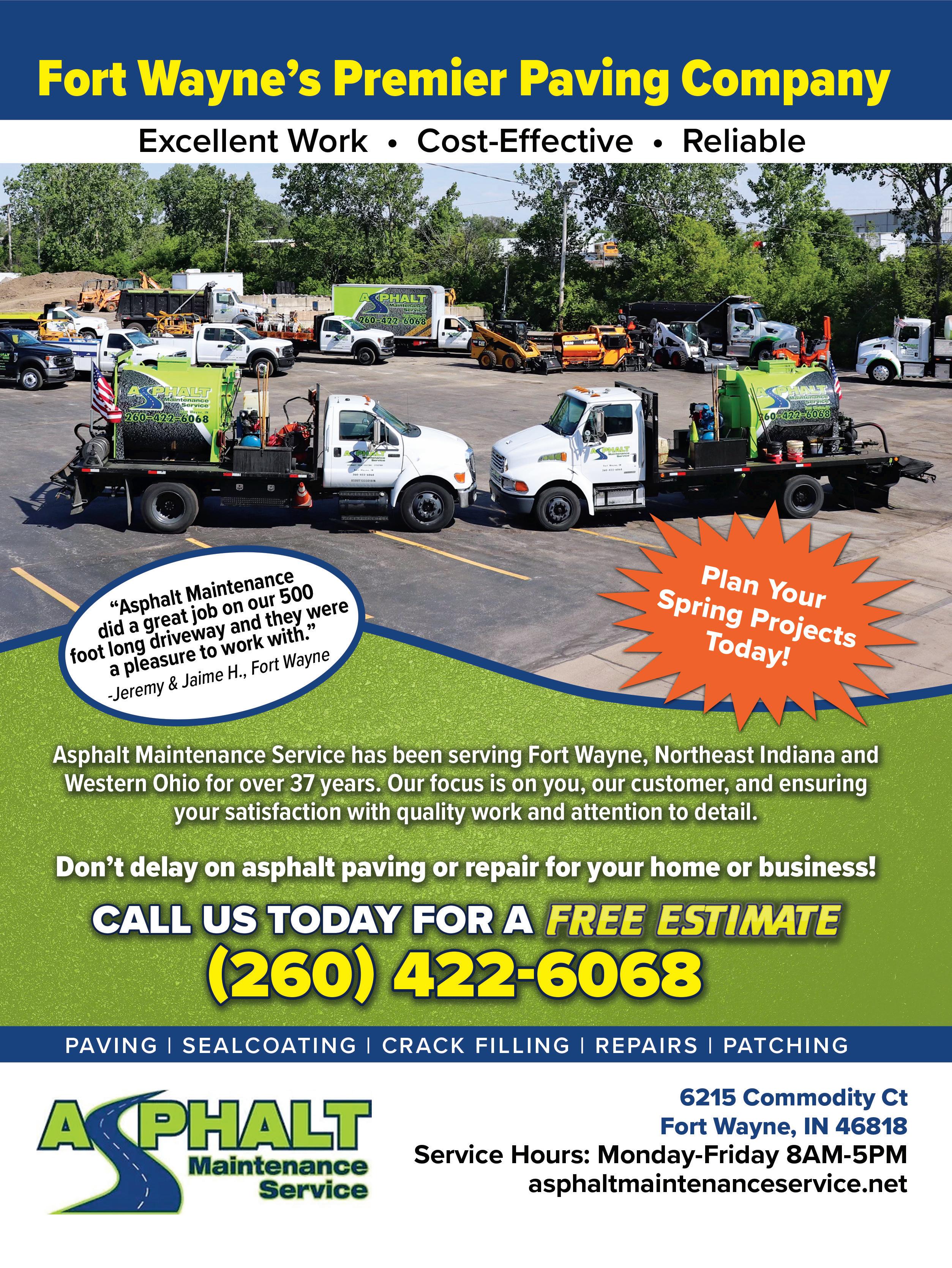 Asphalt Maintenance Service prides itself on being a business built on a foundation of trust, high-quality work and unwavering commitment to its clients, keeping their needs and satisfaction at the forefront, Anthony says. The family-owned company has been serving the Fort Wayne, northeast Indiana and western Ohio areas for more than 40 years. Services include asphalt
