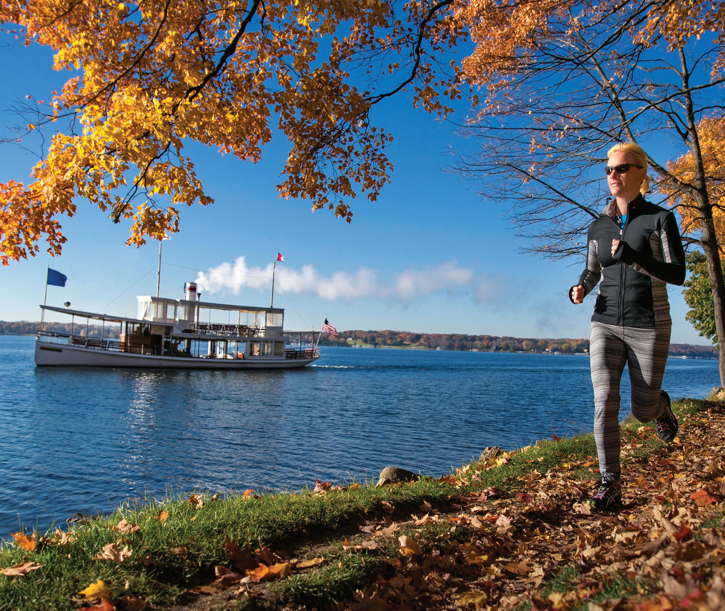 The 21-mile Geneva Lake Shore Path invites walkers and joggers alike with cool air, quiet waves and up-close views of historic estates.