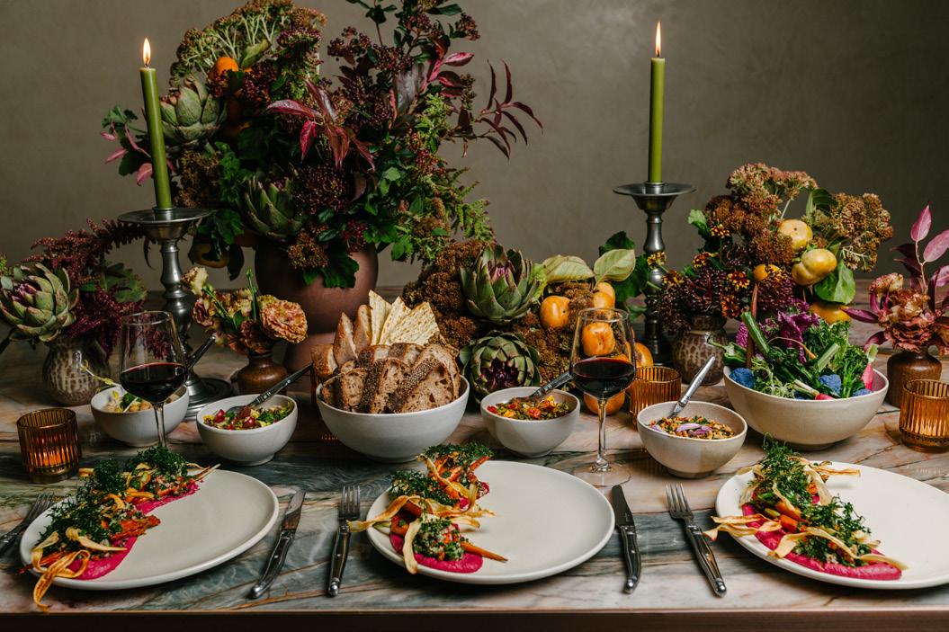 MEZZE TARTE TRIO hummus with olive relish; charred eggplant with tahini, roasted peppers with walnuts (vg)