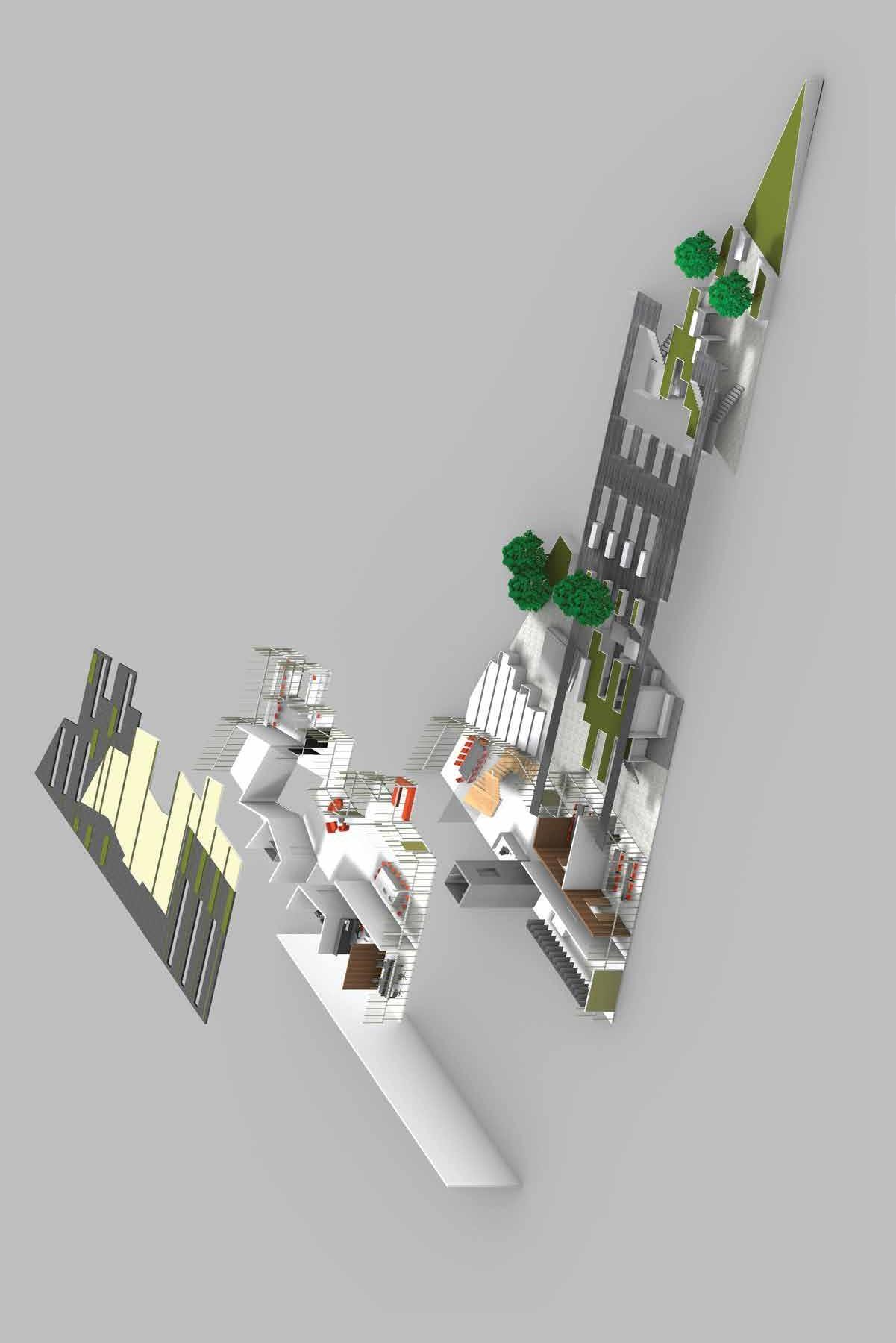 The interior spacial layout is designed to resemble the notion of an infinite everlasting stacking of modules or rooms that would be relatable to the fractals and system of patterns and continuations that come from the resulting repetitive forms.