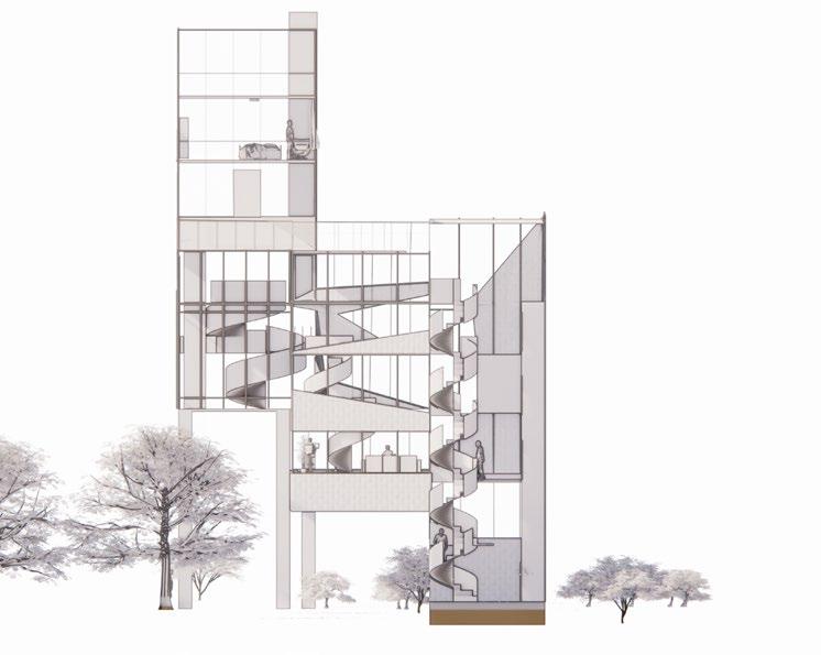 The objective of this design is to establish a Center of Humanity within the central heart of Yale University campus, opposite the Sterling Memorial Library within 451 College St. My design involves the concept of dividing the institute into two “J-Shaped” wings. Connecting these two wings is a glass Hybrid Spine that interlocks them together and opens into each of the individual research centers’ public hybrid spaces as well as acting as the primary entrance for the research center.