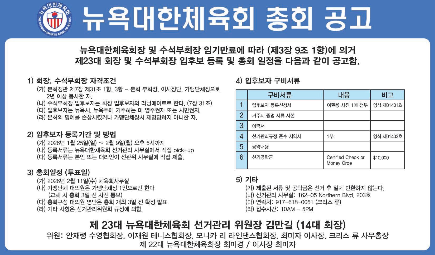 방안에 대한 논의로 산업전반에 전문 교육을 통해 상공인 역량을 강화하고, 미래 산업을 주도할 차 세대 상공인 육성을 위한 체계적 인 교육 프로그램 마련이 필요하 다는데 의견을 합쳤다. 아울러 뉴욕한인회(회장 이명 석)는 오는 2월 27일‘뉴욕 한인의 밤’갈라 행사에 대한 적극적인 참 여를 요청했다. 뉴저지 대한체육 회(회장 박정열)는 2026년 월드컵 홍보 협력 방안, 뉴욕경제인협회 (회장 이창무)는 한인 경제인 간 협력을 통한 동포사회 기여 방안 에 대해 의견을 나눴다. 참석한 전직 회장단은“이제는 상공인 혁신과