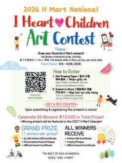 최대 아시안 슈퍼마켓 체 인 H마트가 가정의 달을 맞아 ‘2026 어린이 그림 그리기 대회’ 를 개최한다. 이번 대회의 주제는‘내가 가 장 좋아하는 H마트와의 순간 (Draw Your Favorite H Mart Moment)’으로, 매장에서의 즐거 운 경험이나 가족과 함께한 요리 시간, 피크닉 등 H 마트와 관련된 다양한 순간을 자유롭게 그림으 로 표현하면 된다.