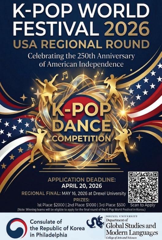뉴욕총영사관 필라델피아 출장소가 후원하는 ‘2026 K- PopWorldFestival’미국지역 예선전이 오는 4월과 5월에 걸쳐 개최된다. [포스터 제공=드렉셀 대학교]